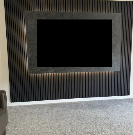 Featuring a bold dark slat backdrop, a sleek inset frame, and soft LED backlighting, this design brings depth, drama, and a luxurious cinematic feel to your room — making your TV the true centerpiece.