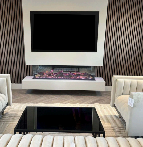 Combining a premium media display with a built-in electric fireplace, rich slatted accents, and a sleek floating hearth, this design blends warmth and style — creating a sophisticated centrepiece for your home.